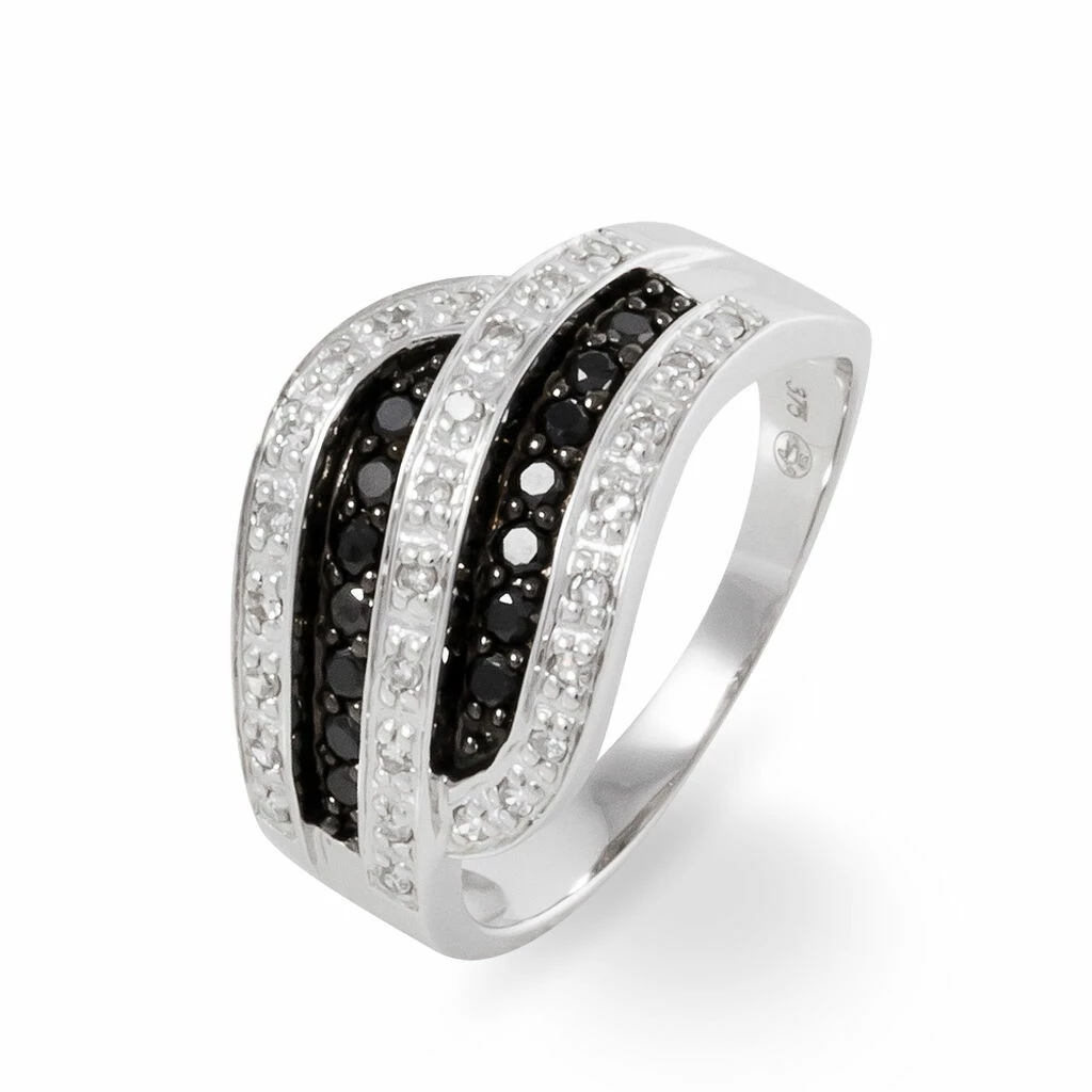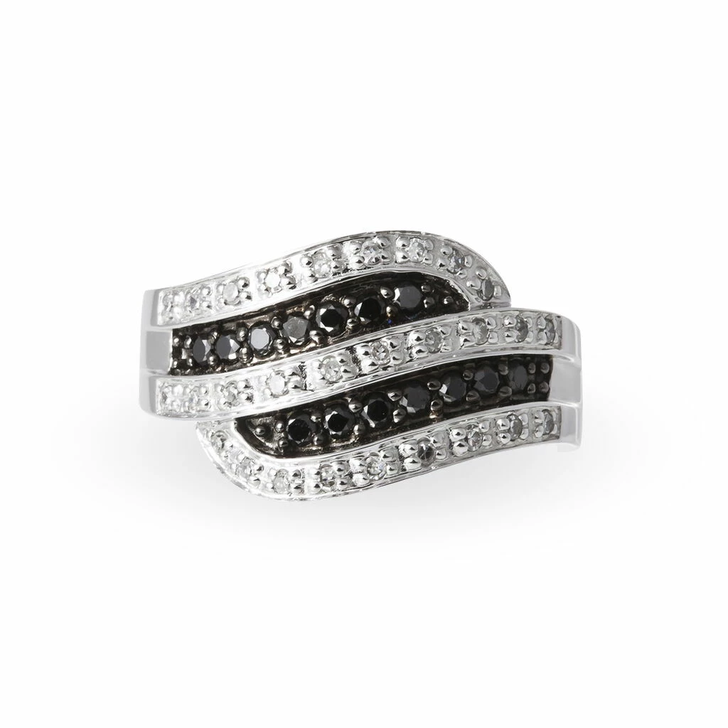 Bague Or Blanc 375/1000 Vagues Diamants Noirs Et Blancs 0.37ct Micro Serti