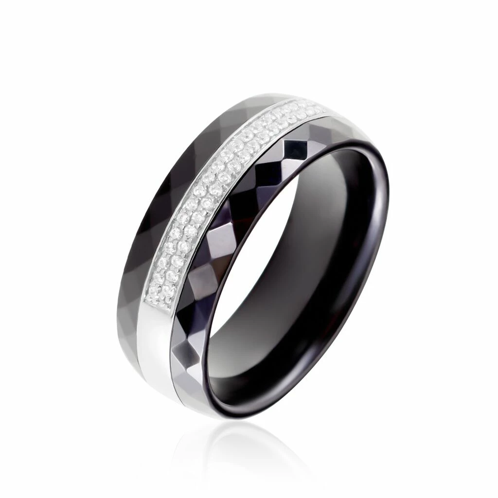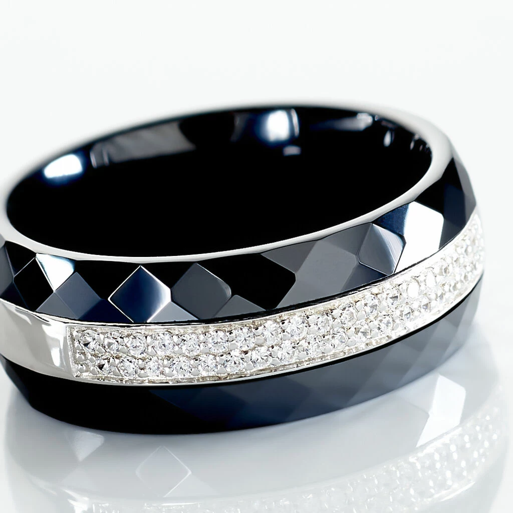 Bague Argent Blanc 925/1000 Ceramique Noire Facettee 2 Rangs Oxydes De Zirconium Blancs