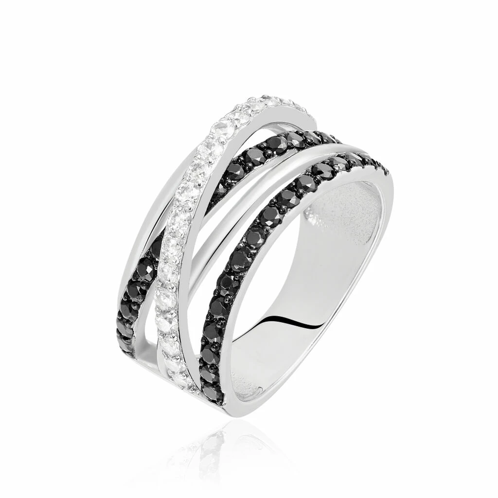 Bague Argent 925/1000 Forme Vague Entrelace Semi Pavage Oxydes De Zirconium Noirs Et Blancs