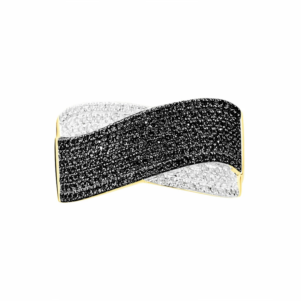 Bague Or Jaune 375/1000 Pavage Diamants Blancs Et Noirs Forme Ruban