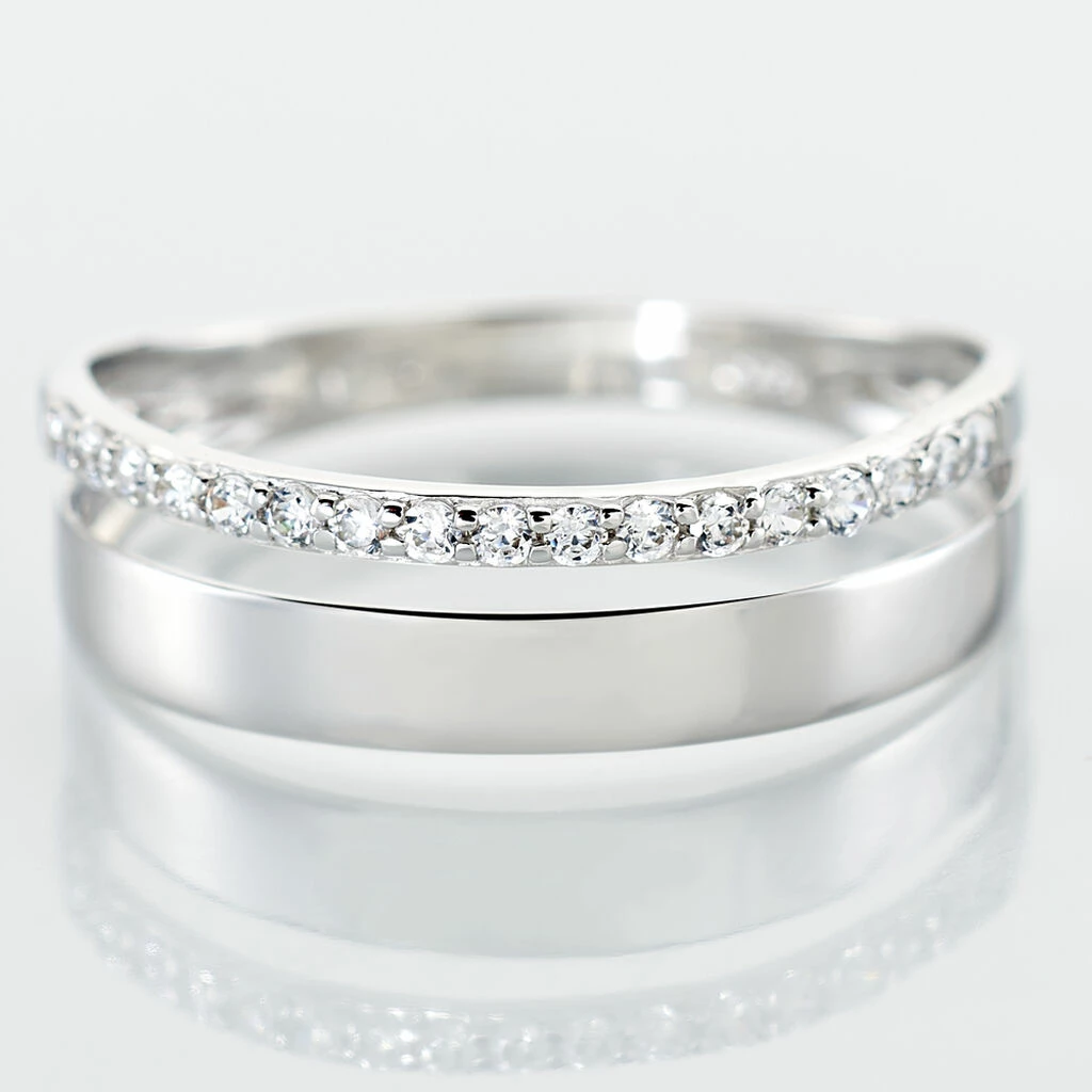 Bague Or Blanc 375/1000 Double Rang Ajoure Semi Pavage Oxydes De Zirconium
