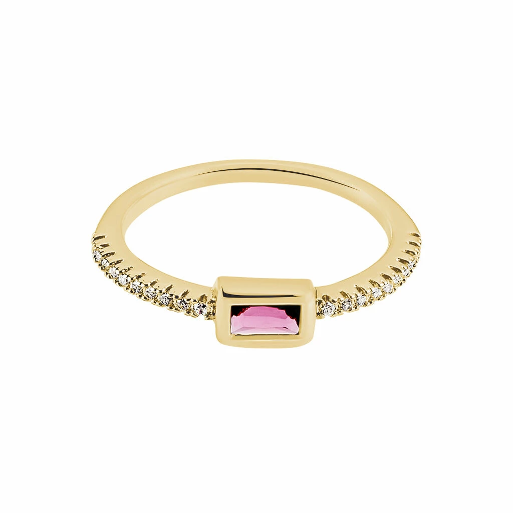 Bague Plaque Or Jaune Pierre Rouge Centrale Forme Barrette Accompagnee Pavage Oxydes De Zirconium