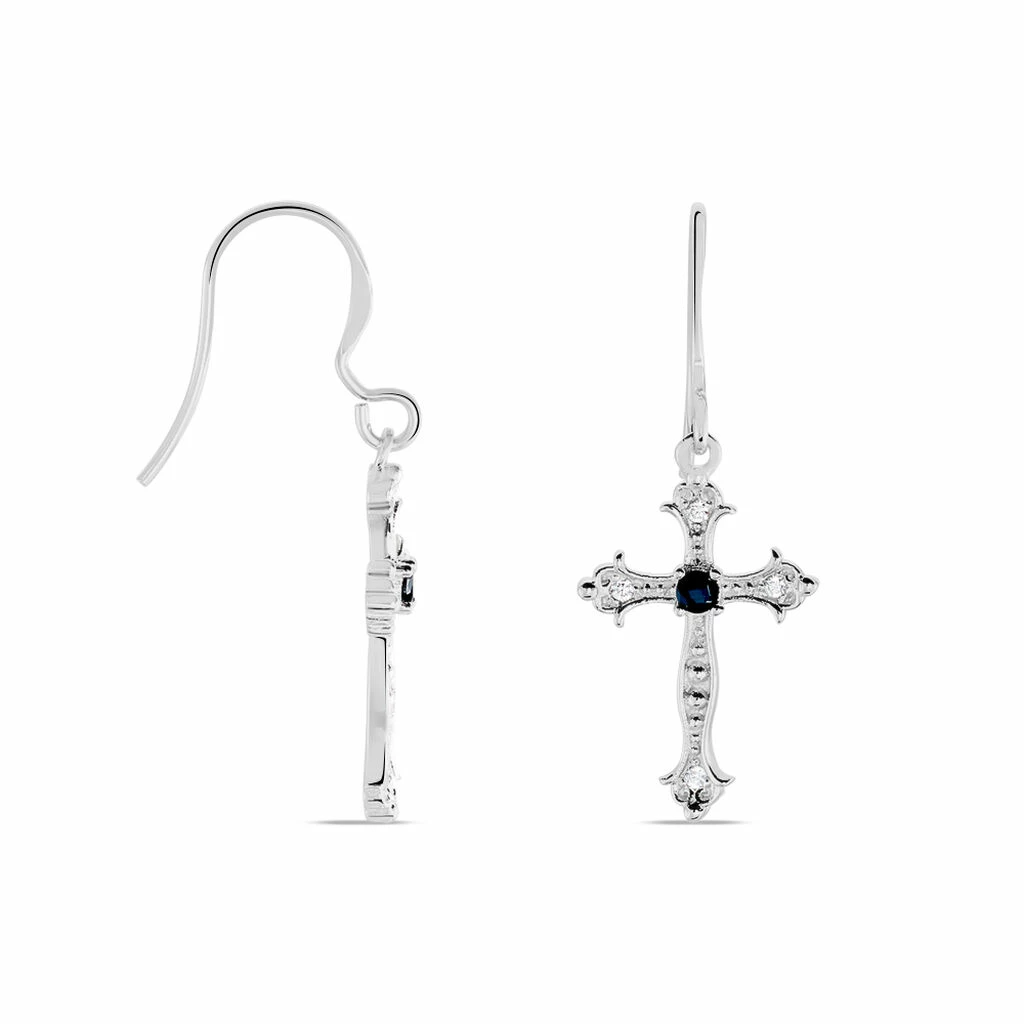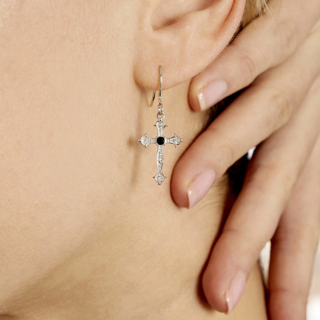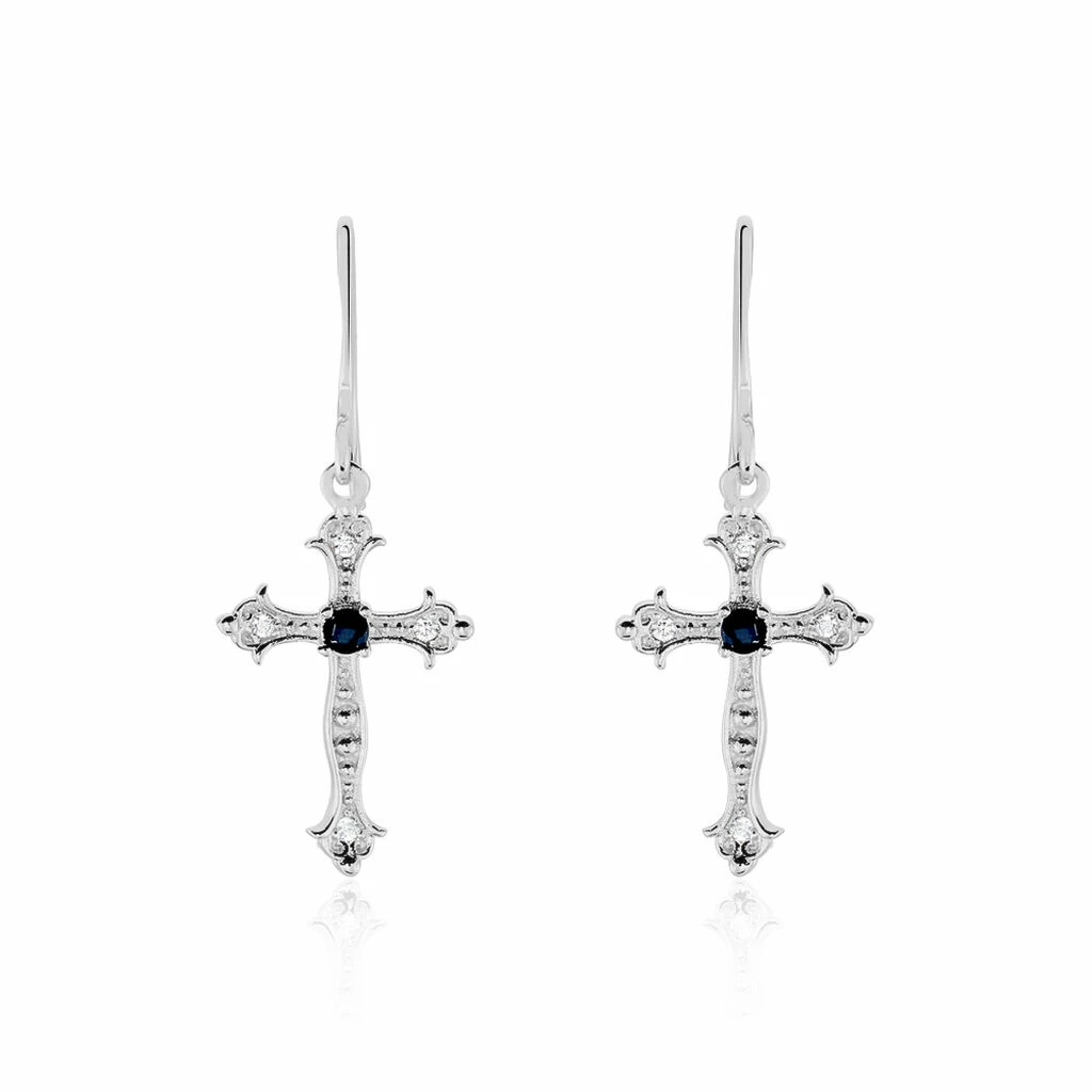 Boucles D’oreilles Pendantes Argent Blanc 925/1000 Croix Gothique Micro-setting Oxydes De Zirconium