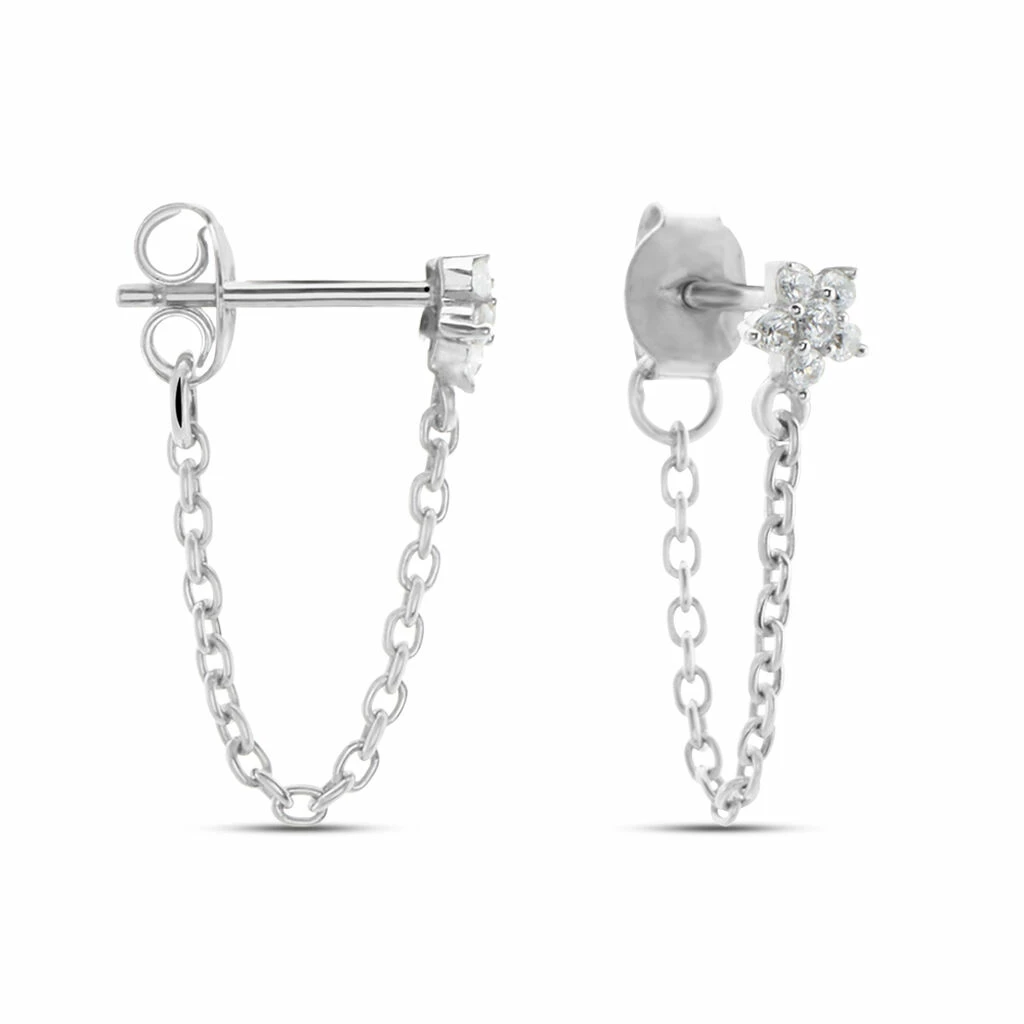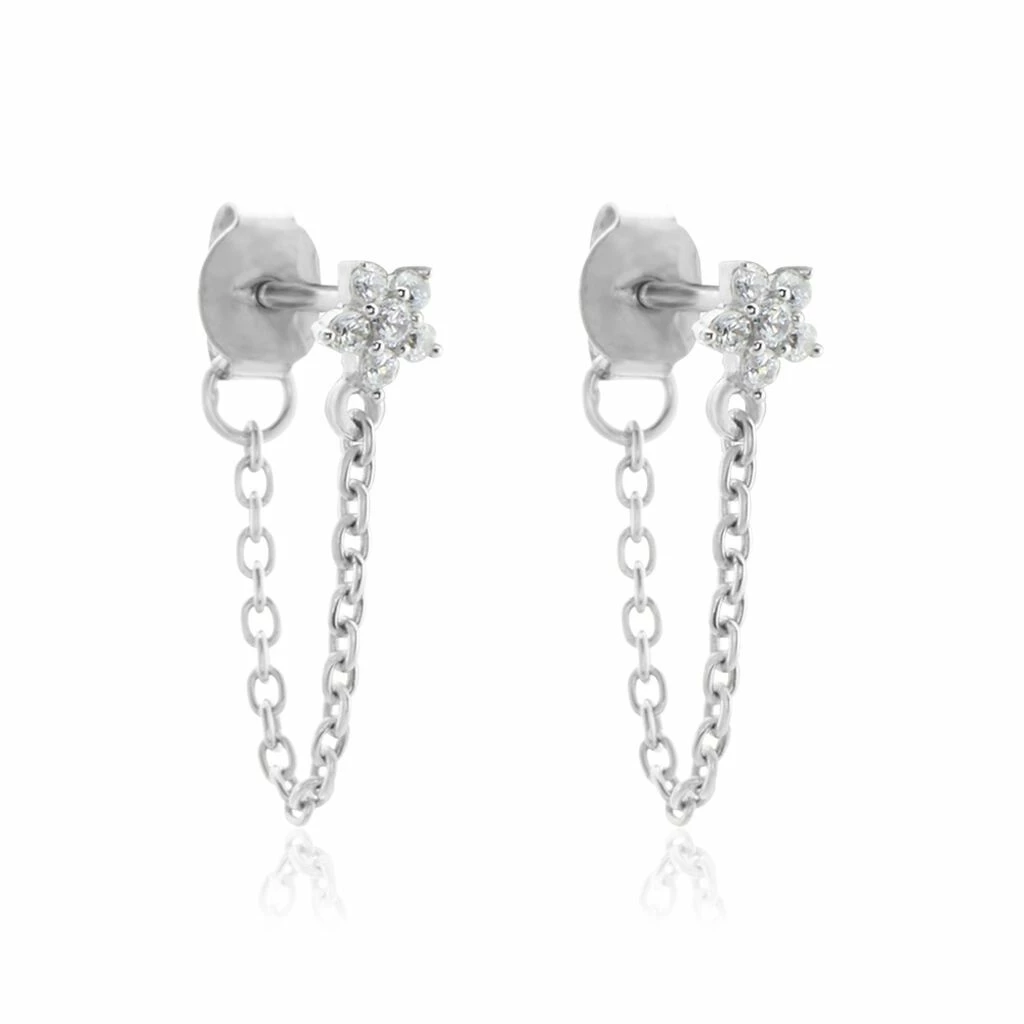 Boucles D’oreilles Pendantes Argent Blanc 925/1000 Fleurs Pavage Oxydes De Zirconium Chaine Maille Forcat