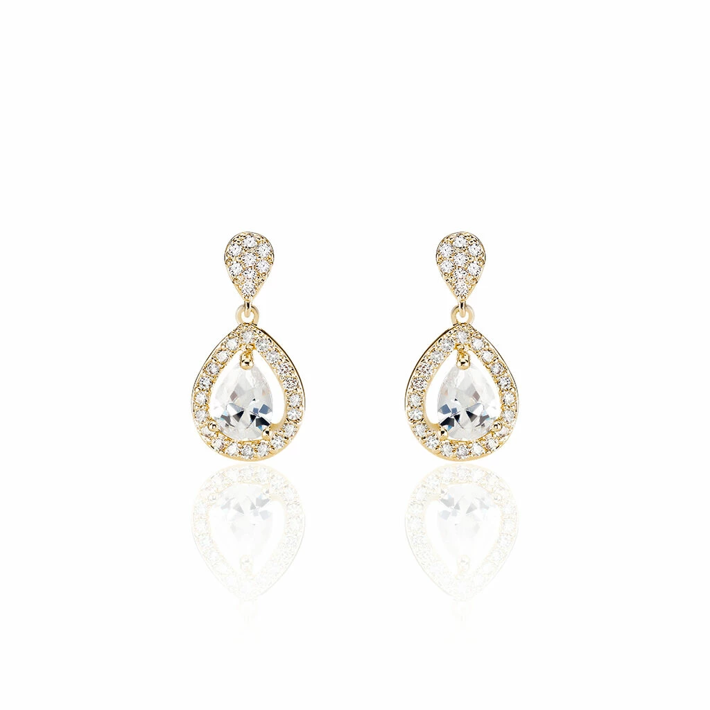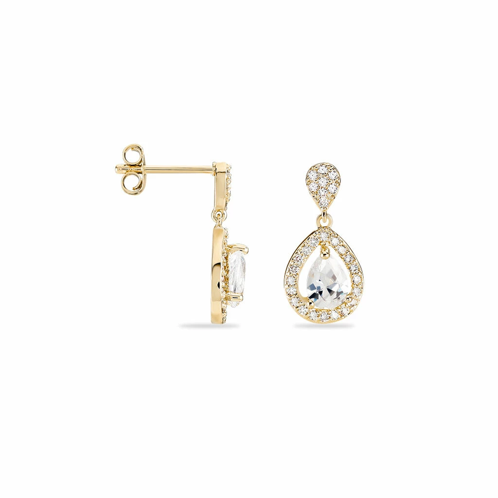 Boucles D’oreilles Pendantes Plaque Or Jaune Oxydes De Zirconium Forme Poire Entourage Oxydes De Zirconium