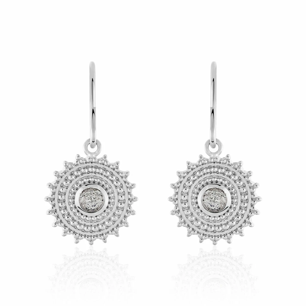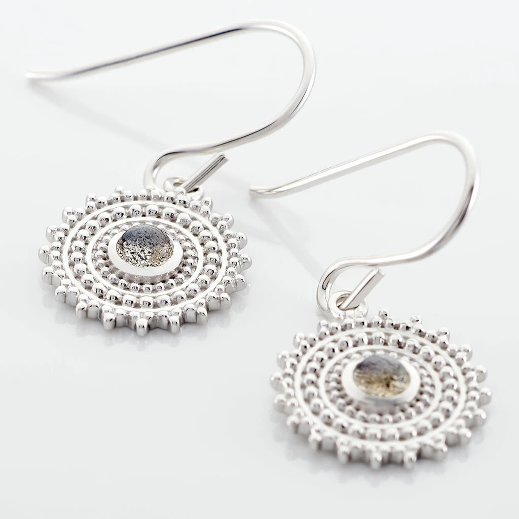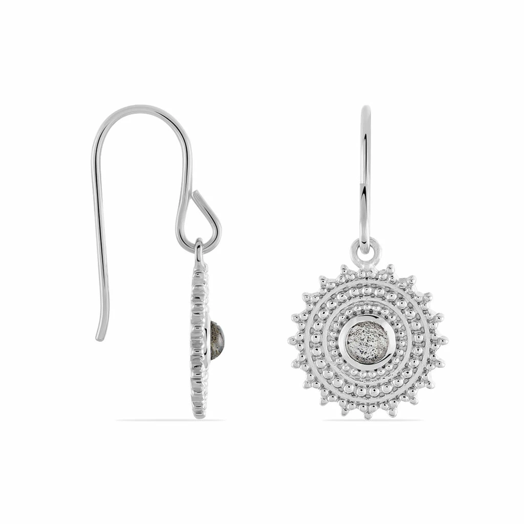 Boucles D’oreilles Pendantes Argent Blanc 925/1000 Rosaces Perlees Labradorites Rondes Centrales