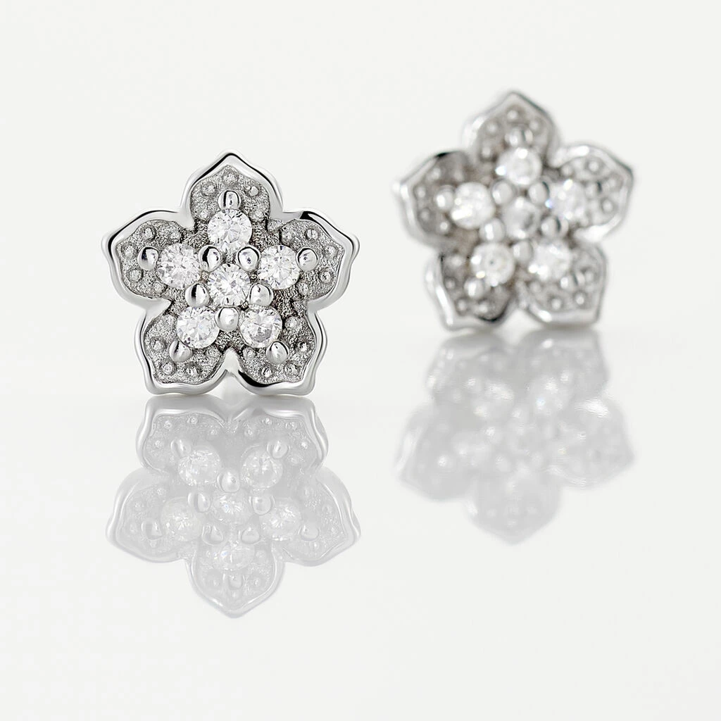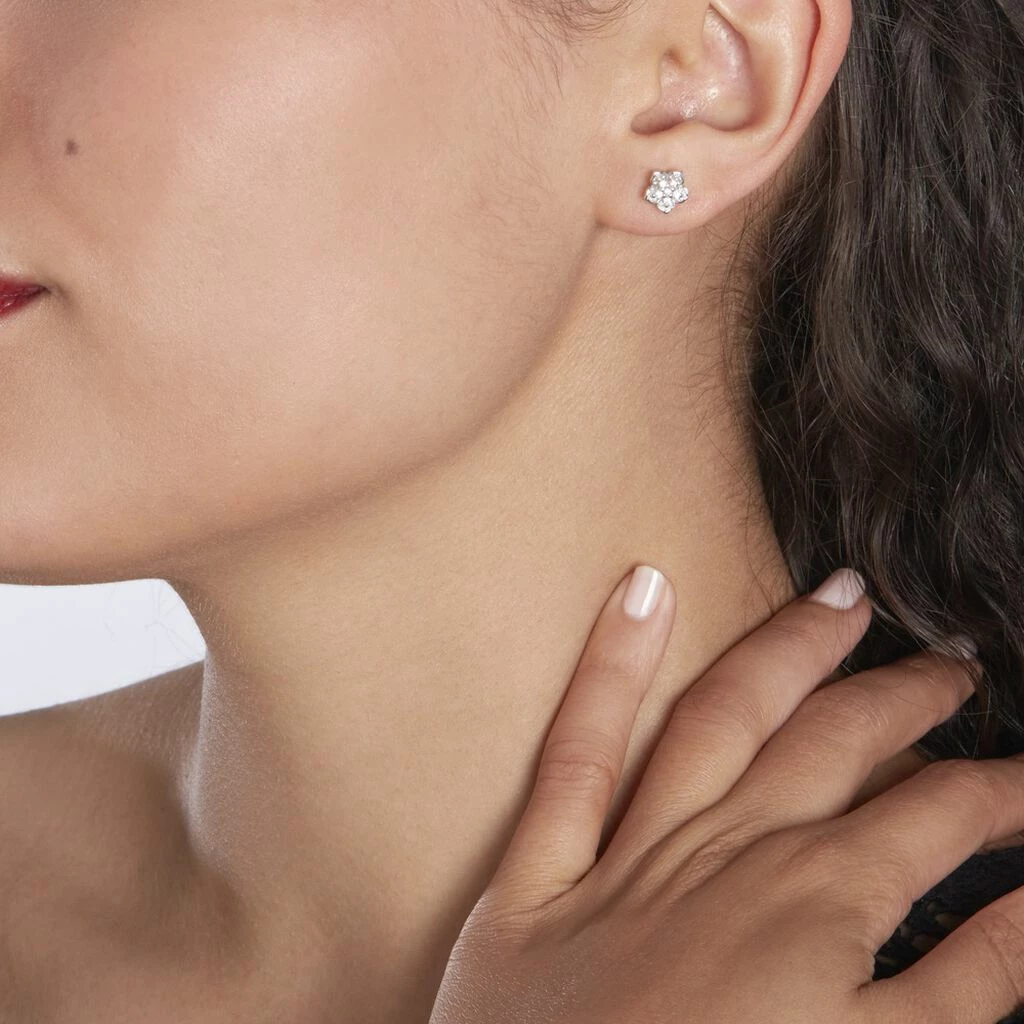 Boucles D’oreilles Puces Argent Blanc 925/1000 Motifs Fleurs Pavage Oxydes De Zirconium
