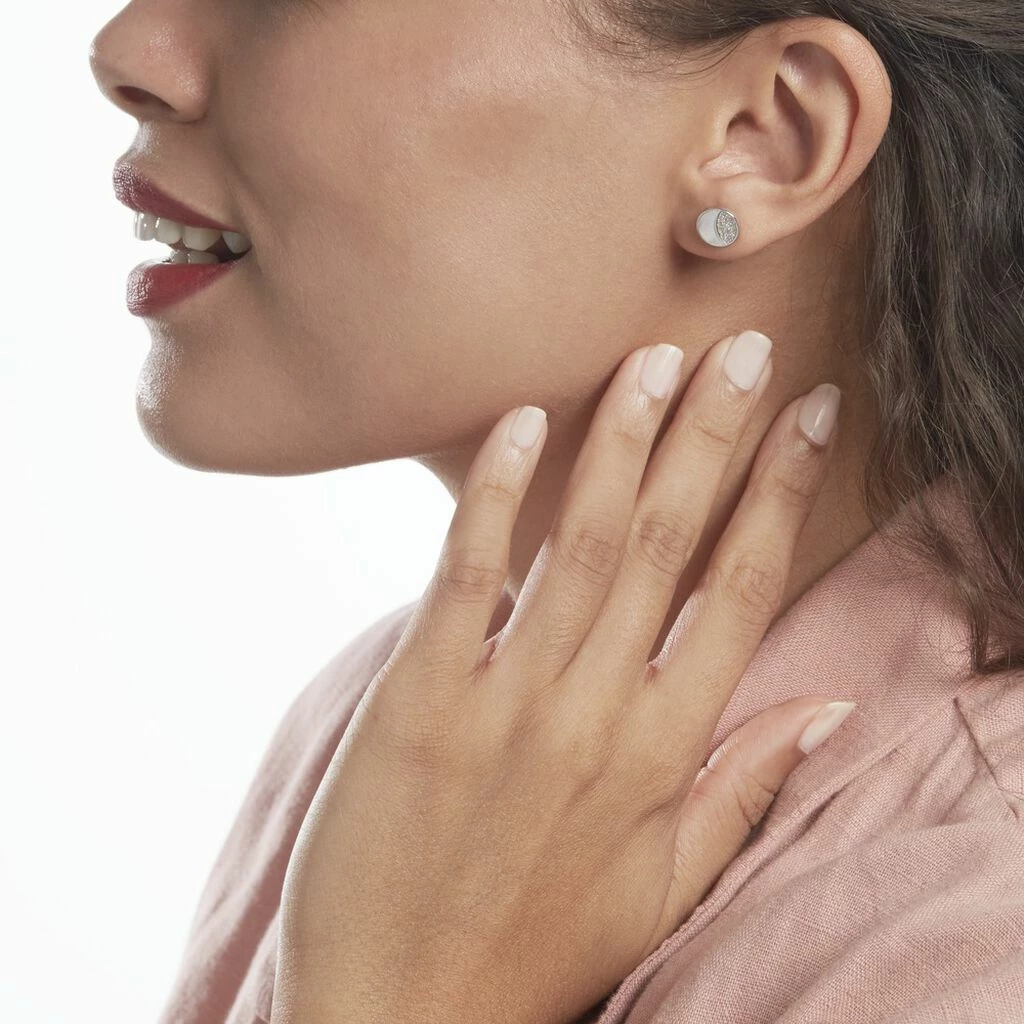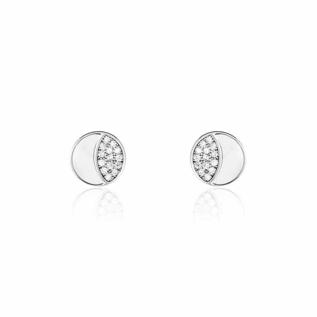Boucles D’oreilles Puces Argent Blanc 925/1000 Lunes Nacre Pavage Oxydes De Zirconium