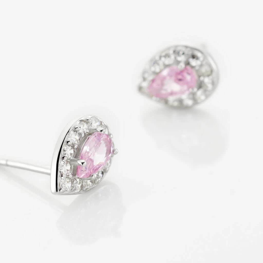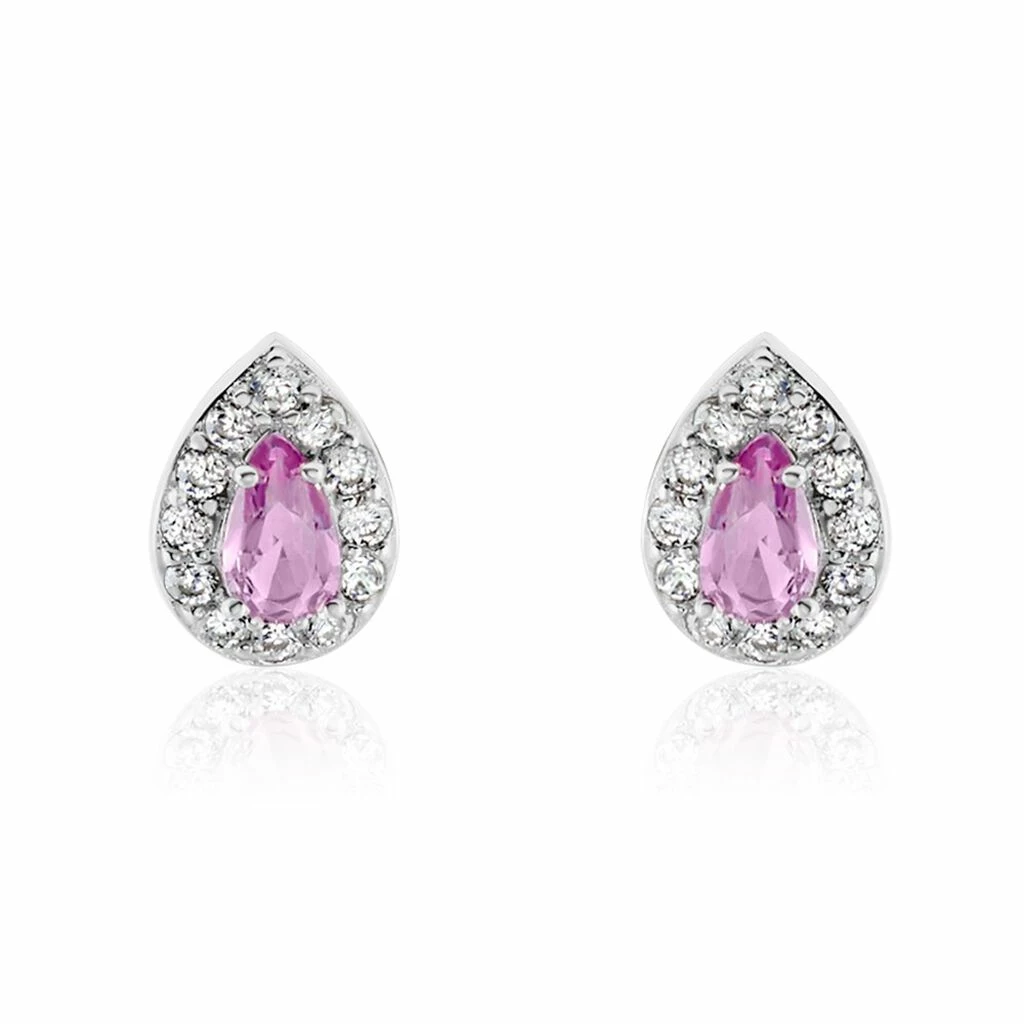Boucles D’oreilles Puces Argent Blanc 925/1000 Gouttes Roses Entourage Sertis Griffes Oxydes De Zirconium