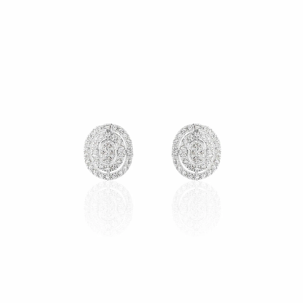 Boucles D’oreilles Puces Argent Blanc 925/1000 Entourages Ajoures Formes Ovales Pavage Oxydes De Zirconium