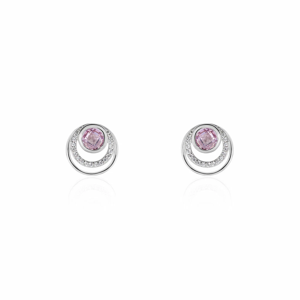 Boucles D’oreilles Argent Blanc 925/1000 Multicercles Micro Setting Oxydes De Zirconium Et Oxyde Facettes Rose Central