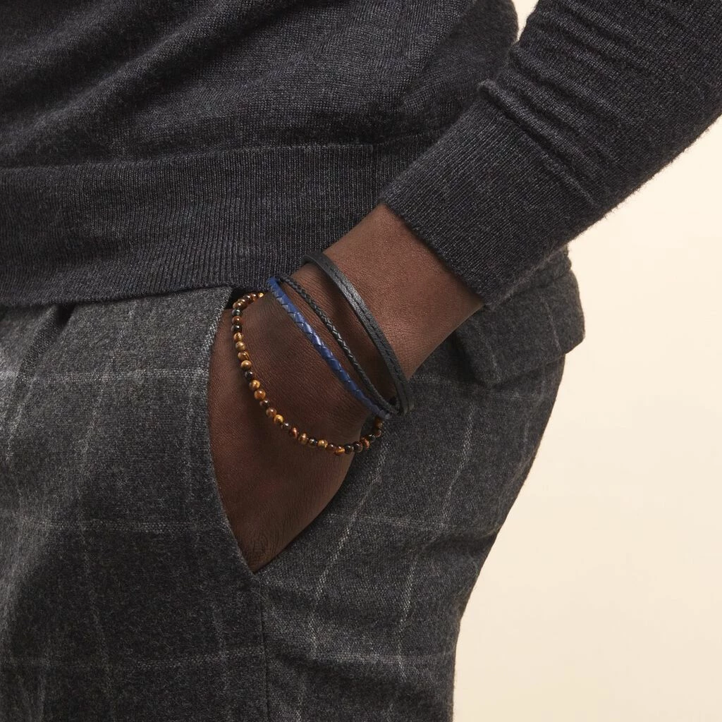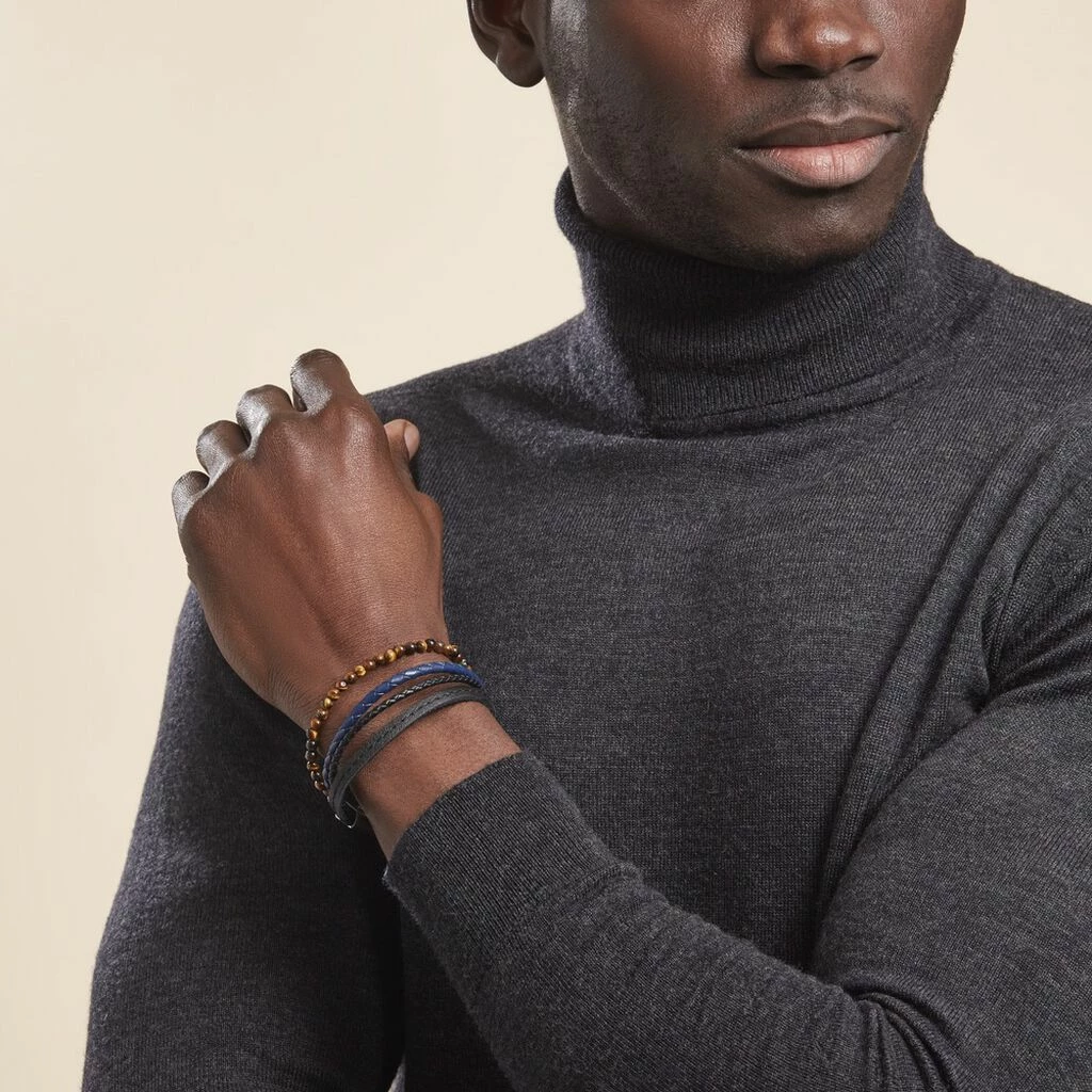Bracelet Acier Blanc Multirangs Cuir De Vache Noir Et Boules œil De Tigre 21cm