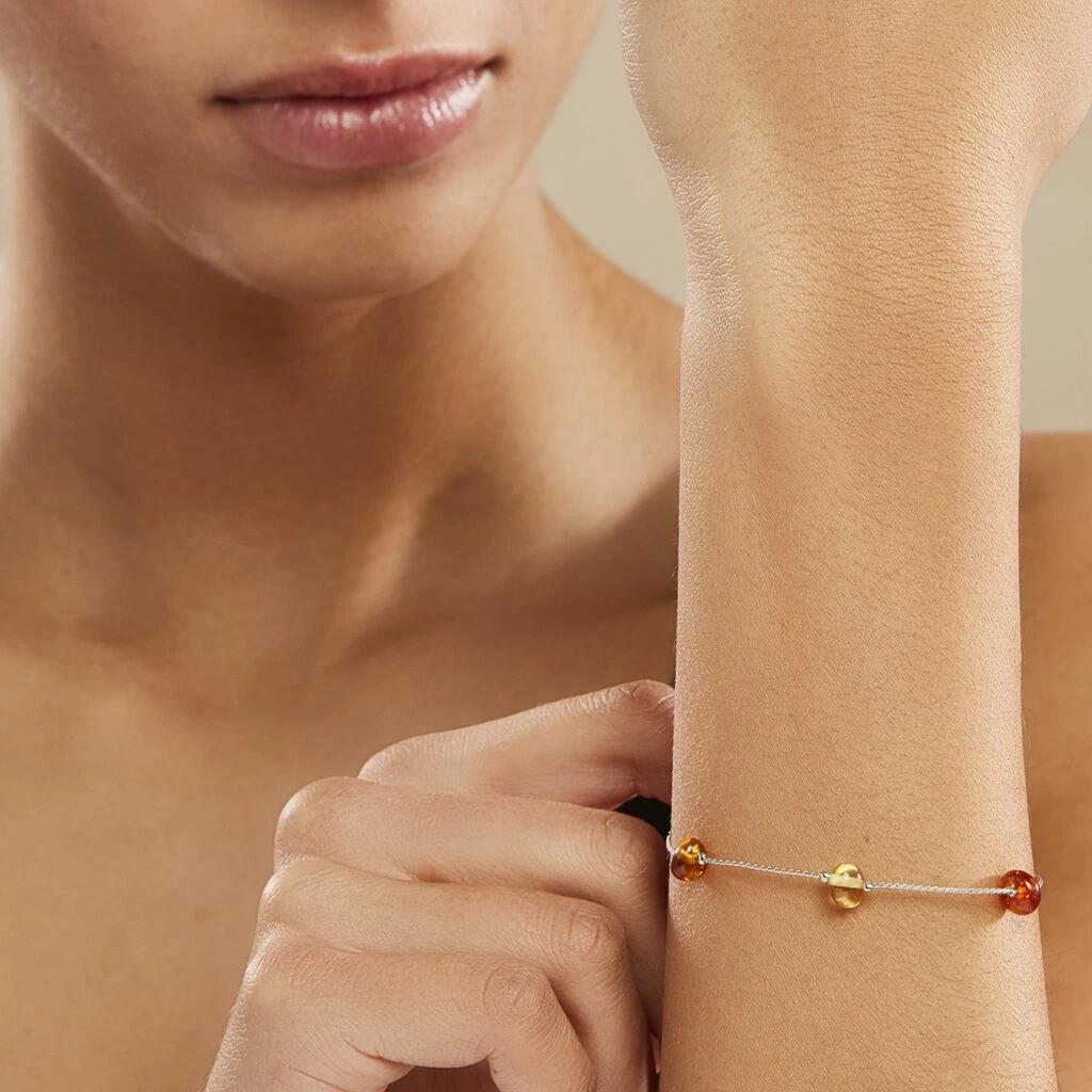 Bracelet Argent Blanc 925/1000 Boules Ambres Multicolores Miel/cognac/marron 19cm