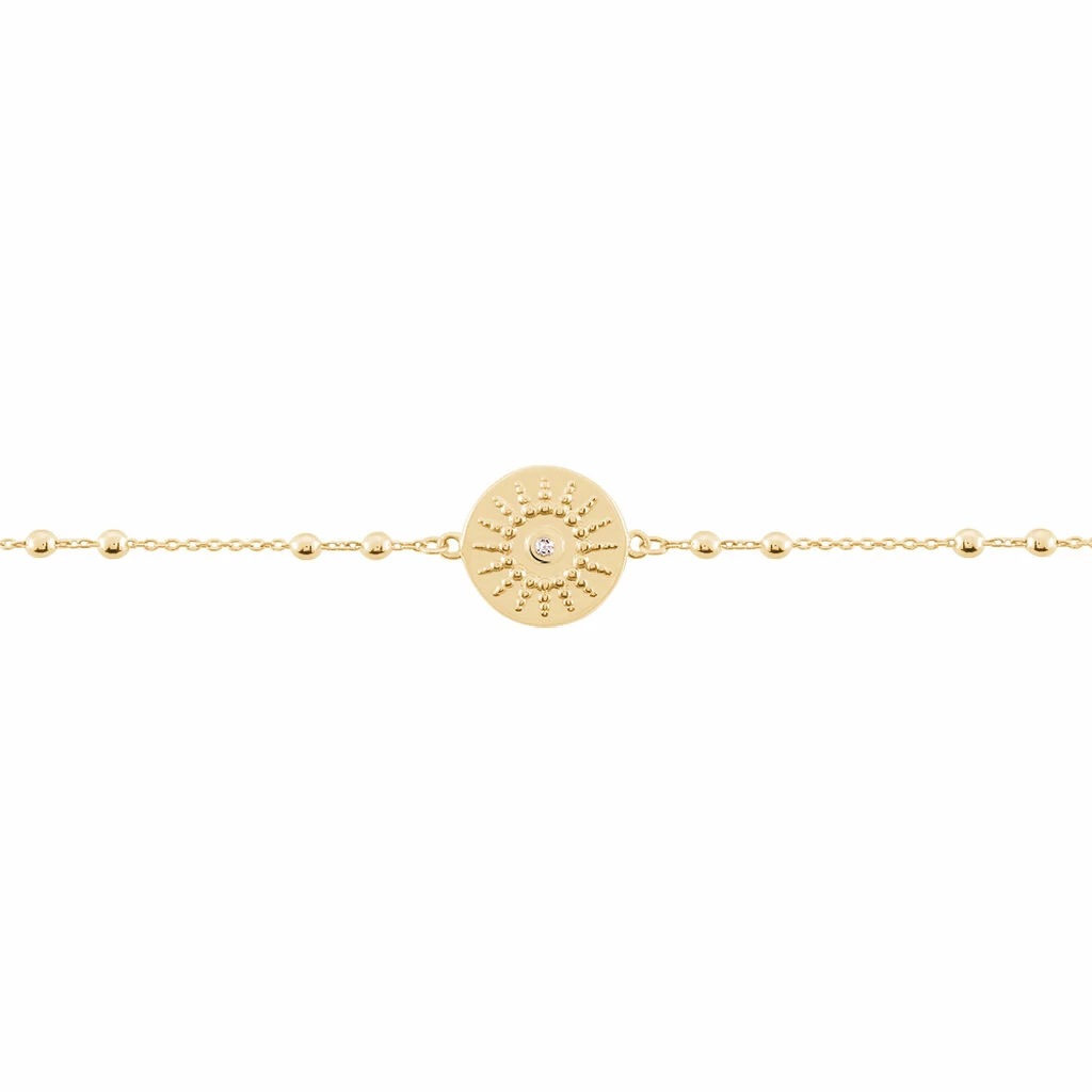 Bracelet Plaqué Or Jaune Forme Pastille Motif Soleil Effet Perle Oxyde De Zirconium 18cm