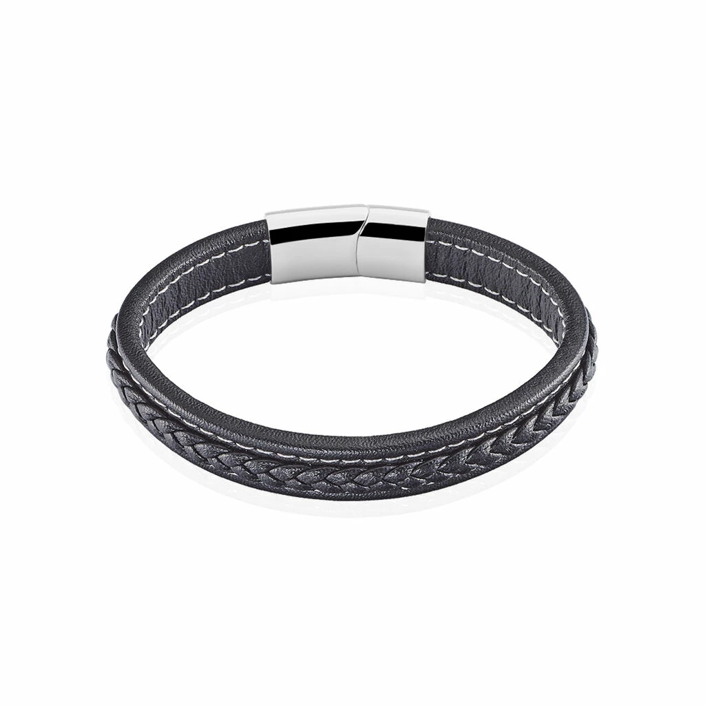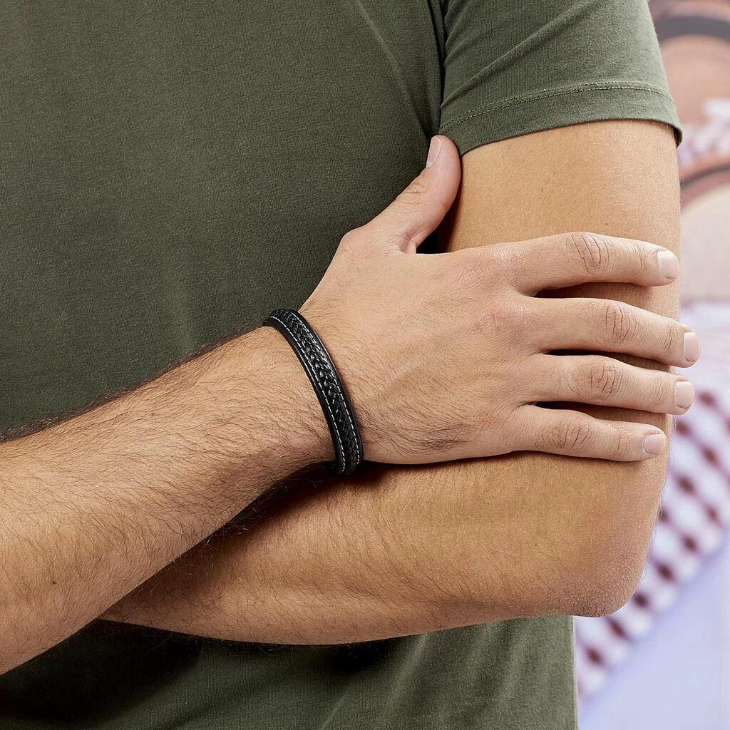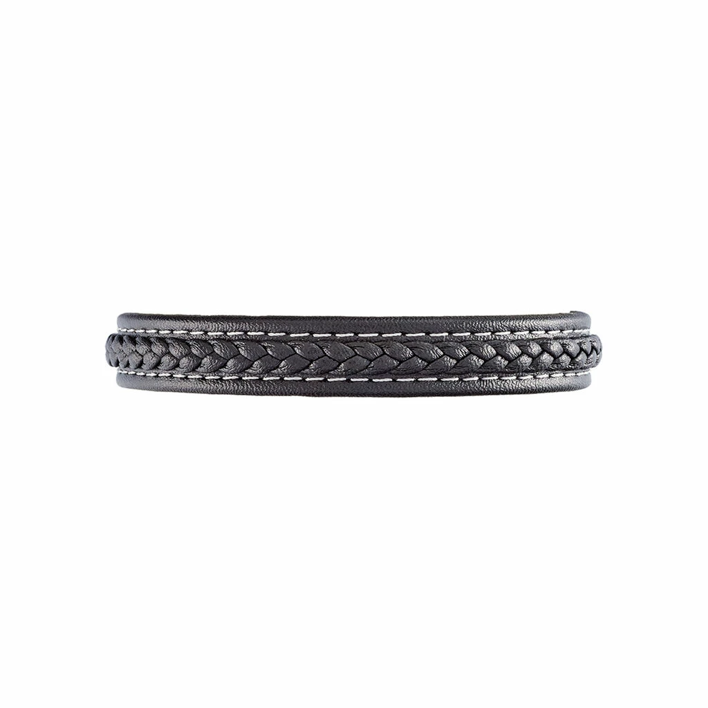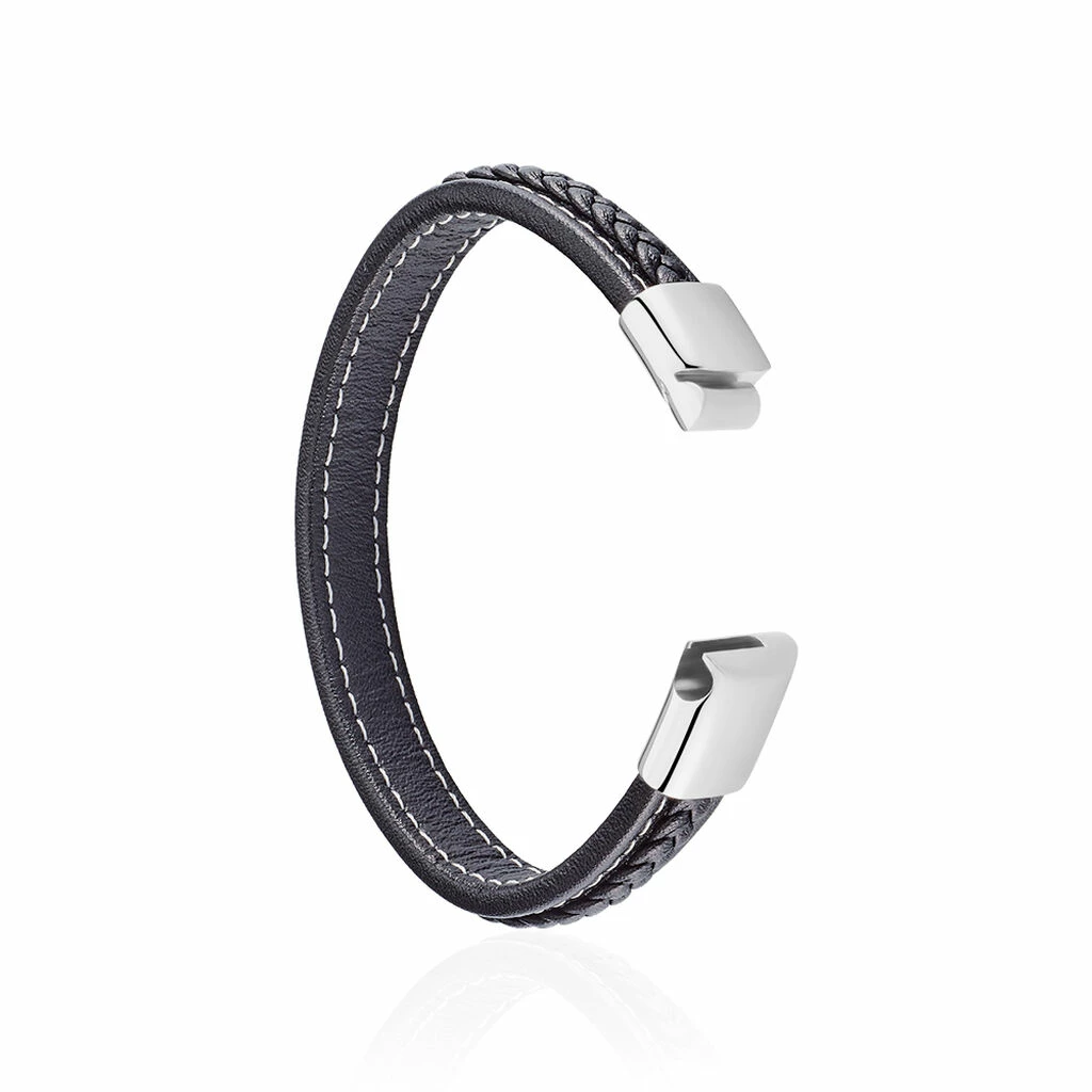 Bracelet Cuir Polyurethane Noir Et Fermoir Acier Gris Surpiqures Et Tresse