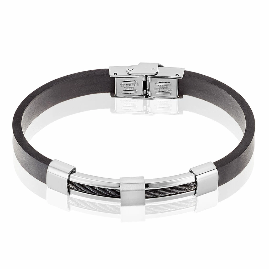 Bracelet Acier Gizelle Plaque Acier Cable Carbone Noir Caoutchouc Noir 21cm