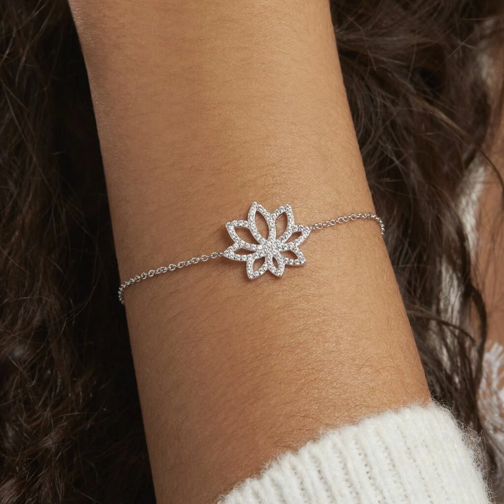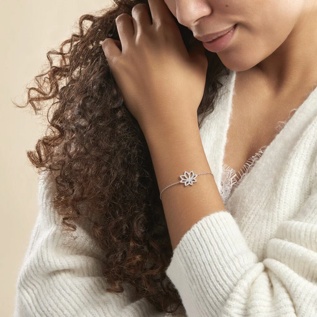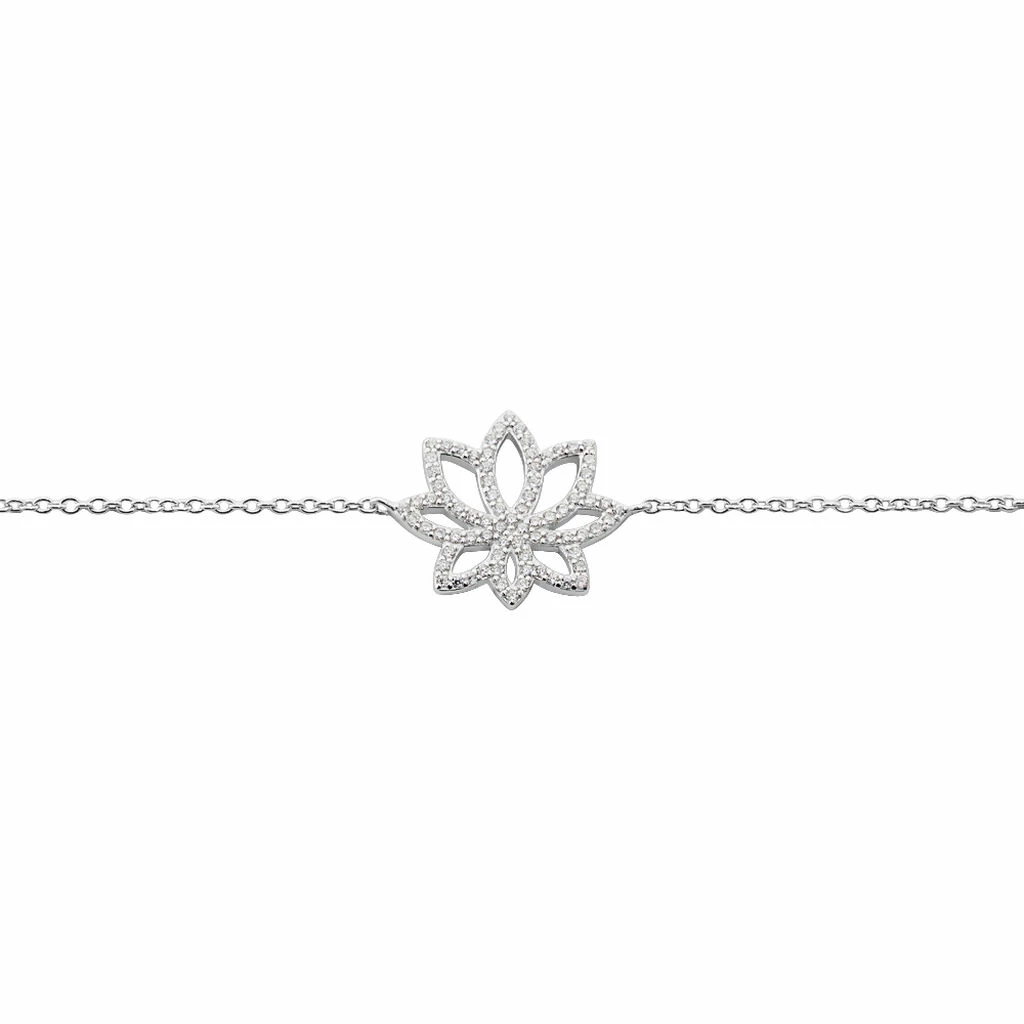 Bracelet Argent Blanc 925/1000 Motif Lotus Avec Oxydes De Zirconium 18.5cm