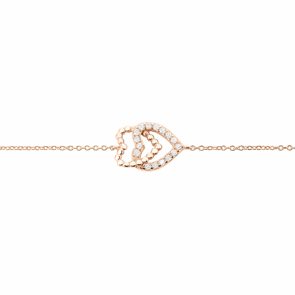 Bracelet Argent Rose 925/1000 Double Cœur Effet Perle Oxydes De Zirconium 18.5cm