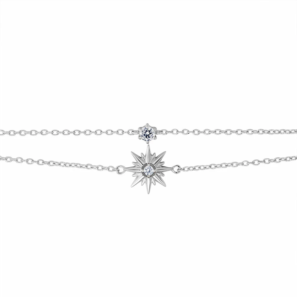 Bracelet Double Chaines Argent Blanc 925/1000 Etoiles Micro Setting Oxydes De Zirconium Maille Forçat 18.5cm