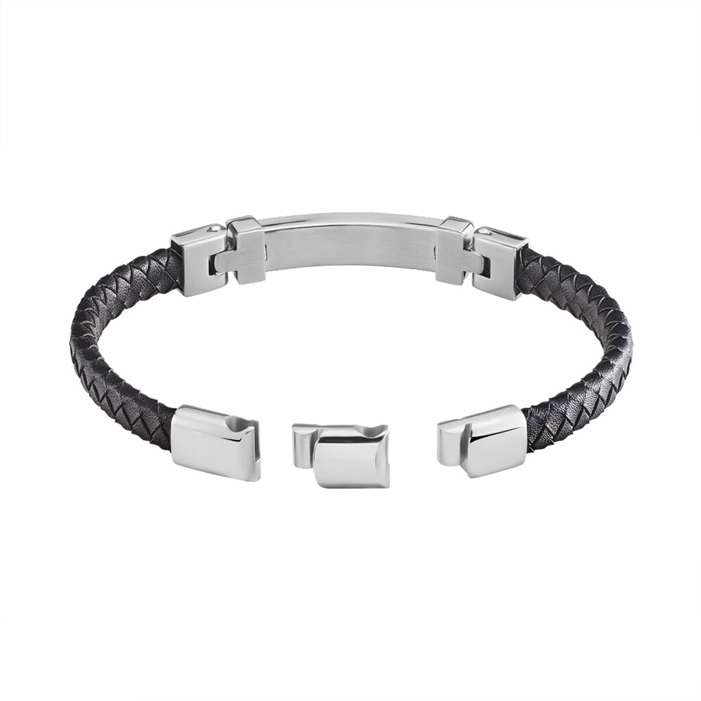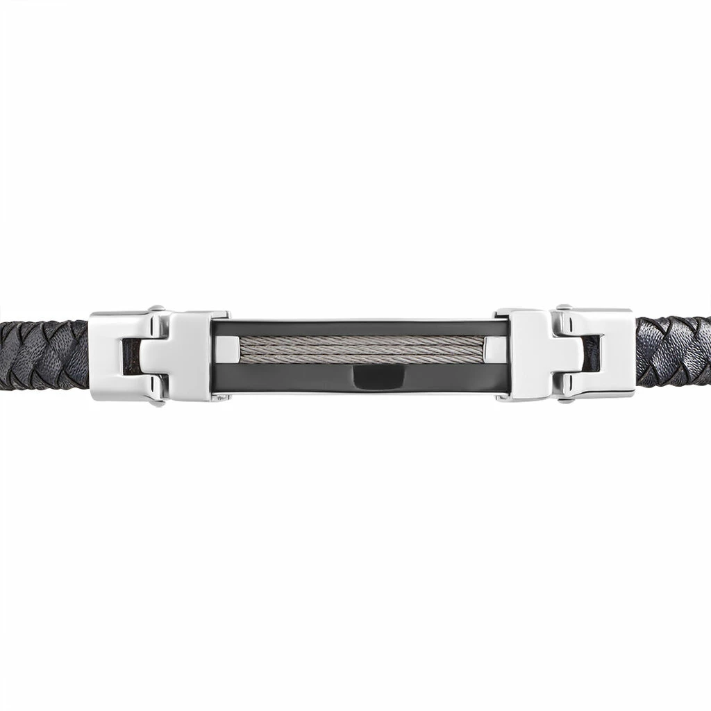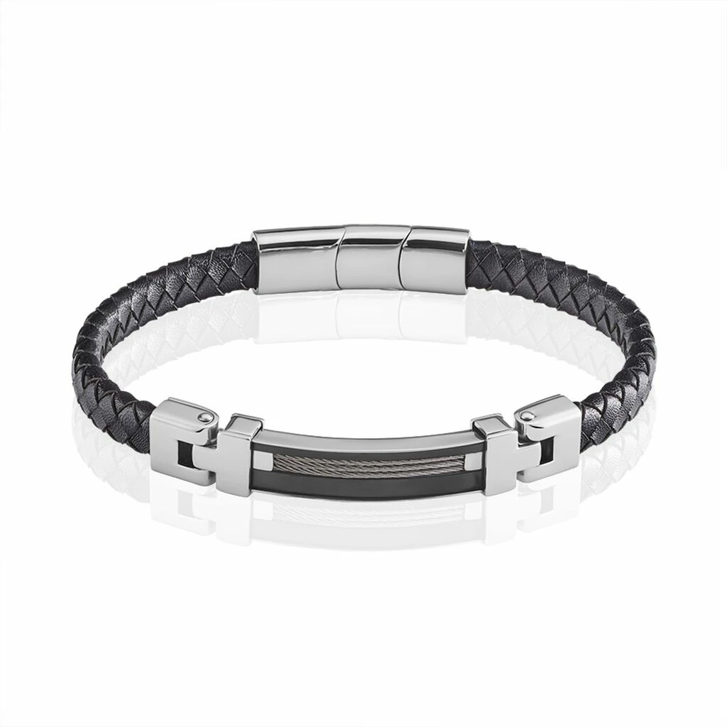 Bracelet Acier Blanc Cuir De Vache Noir Tressé Plaque Acier Ip Noir Et Cables 21cm