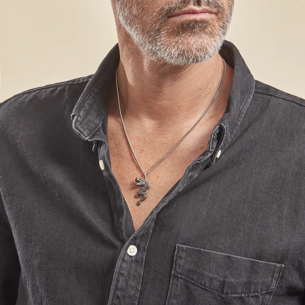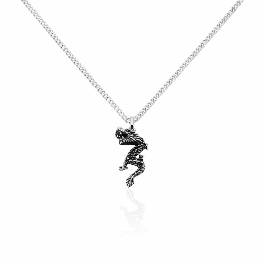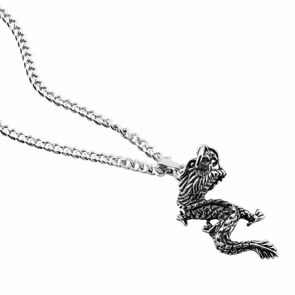 Collier Acier Gris Pendentif Dragon Maille Gourmette 55.5cm