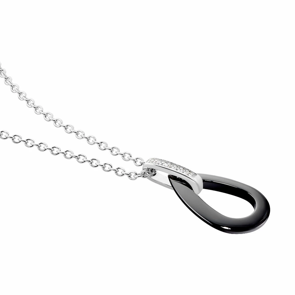 Collier Argent Blanc 925/1000 Motif Ceramique Noire Lisse Goutte Beliere Oxydes De Zirconium 45cm