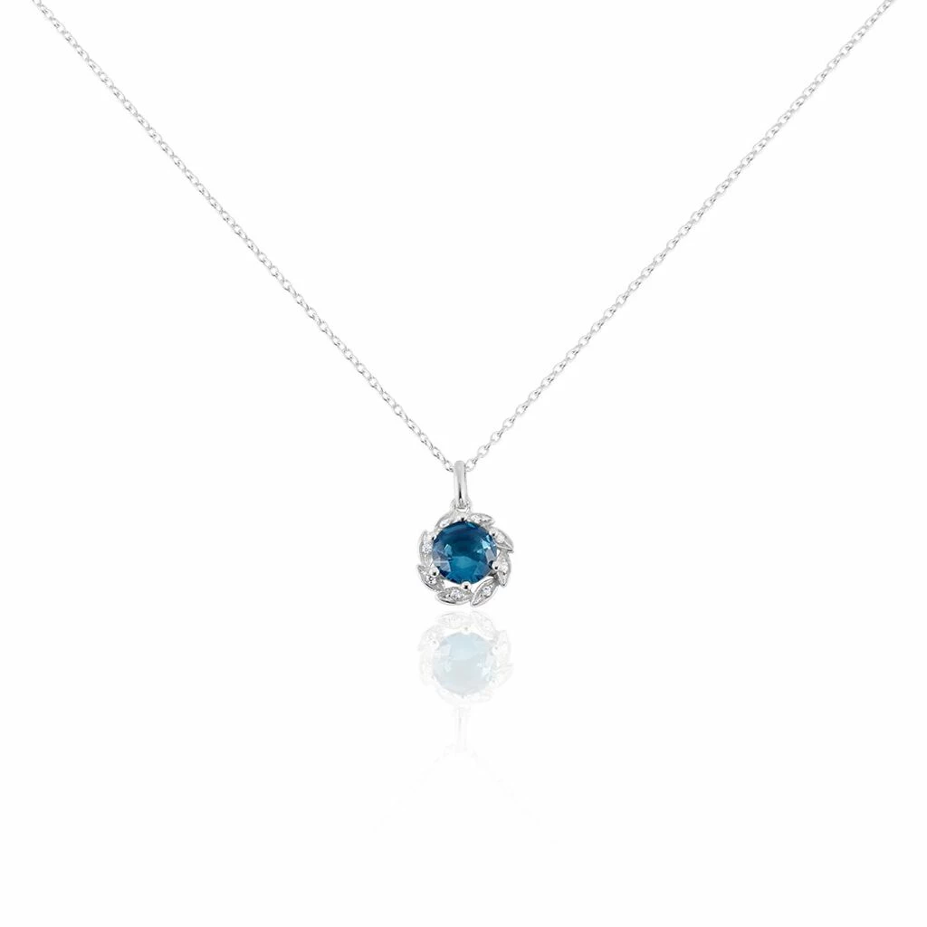 Collier Argent Blanc 925/1000 Fleur En Verre Bleu Serti 6 Griffes Et Oxydes De Zirconium Maille Forçat 44cm