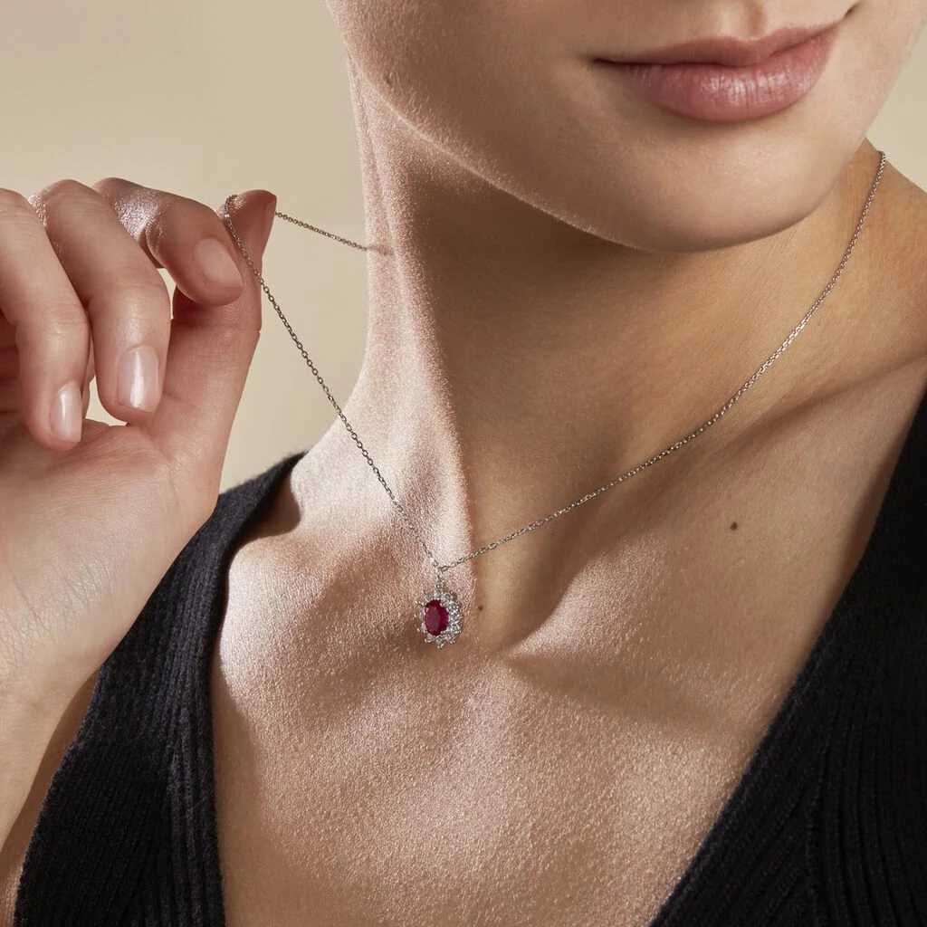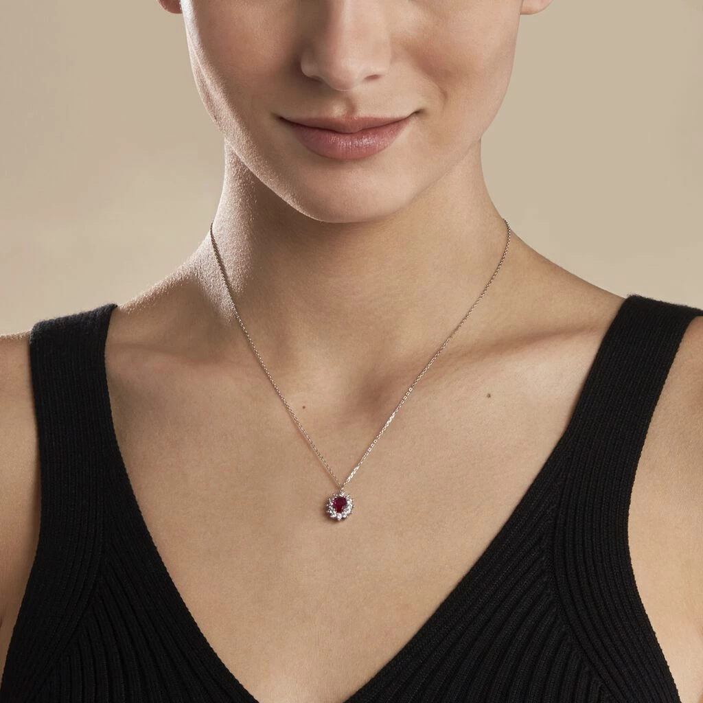 Collier Solitaire Argent Blanc 925/1000 Forme Marguerite Rouge Serti Griffes Entourage Oxydes Maille Forcat 45cm
