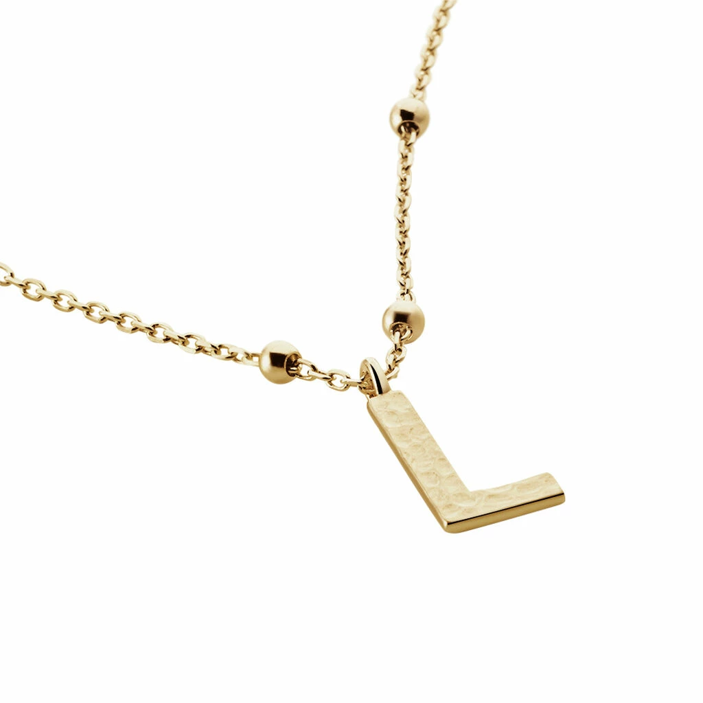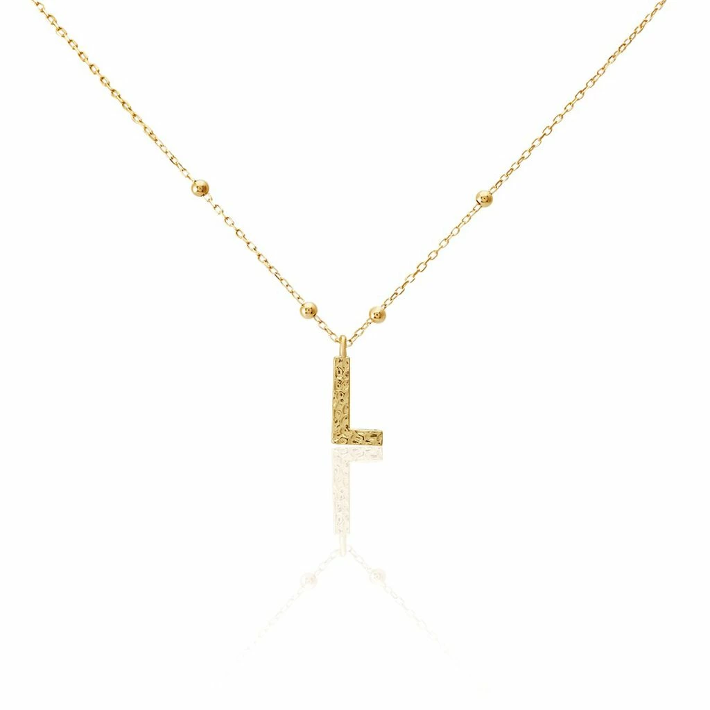 Collier Plaque Or Jaune Lettre L Martelee Et Petites Boules Chaine Maille Forcat Longueur 45cm