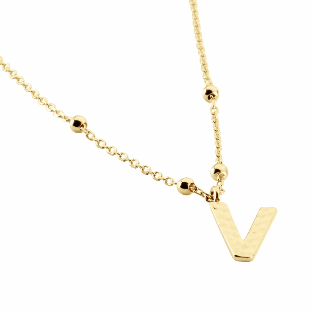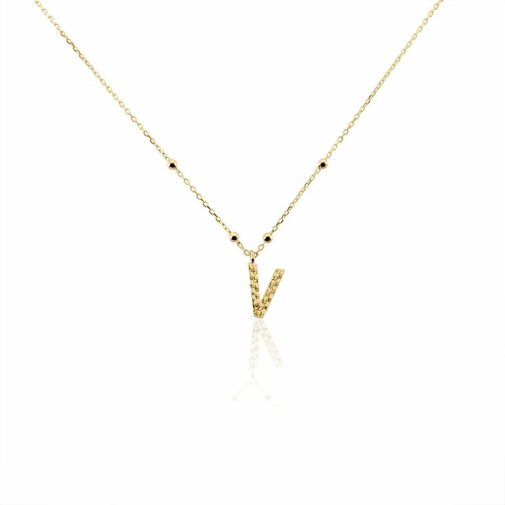 Collier Plaque Or Jaune Lettre V Martelee Et Petites Boules Chaine Maille Forcat Longueur 45cm