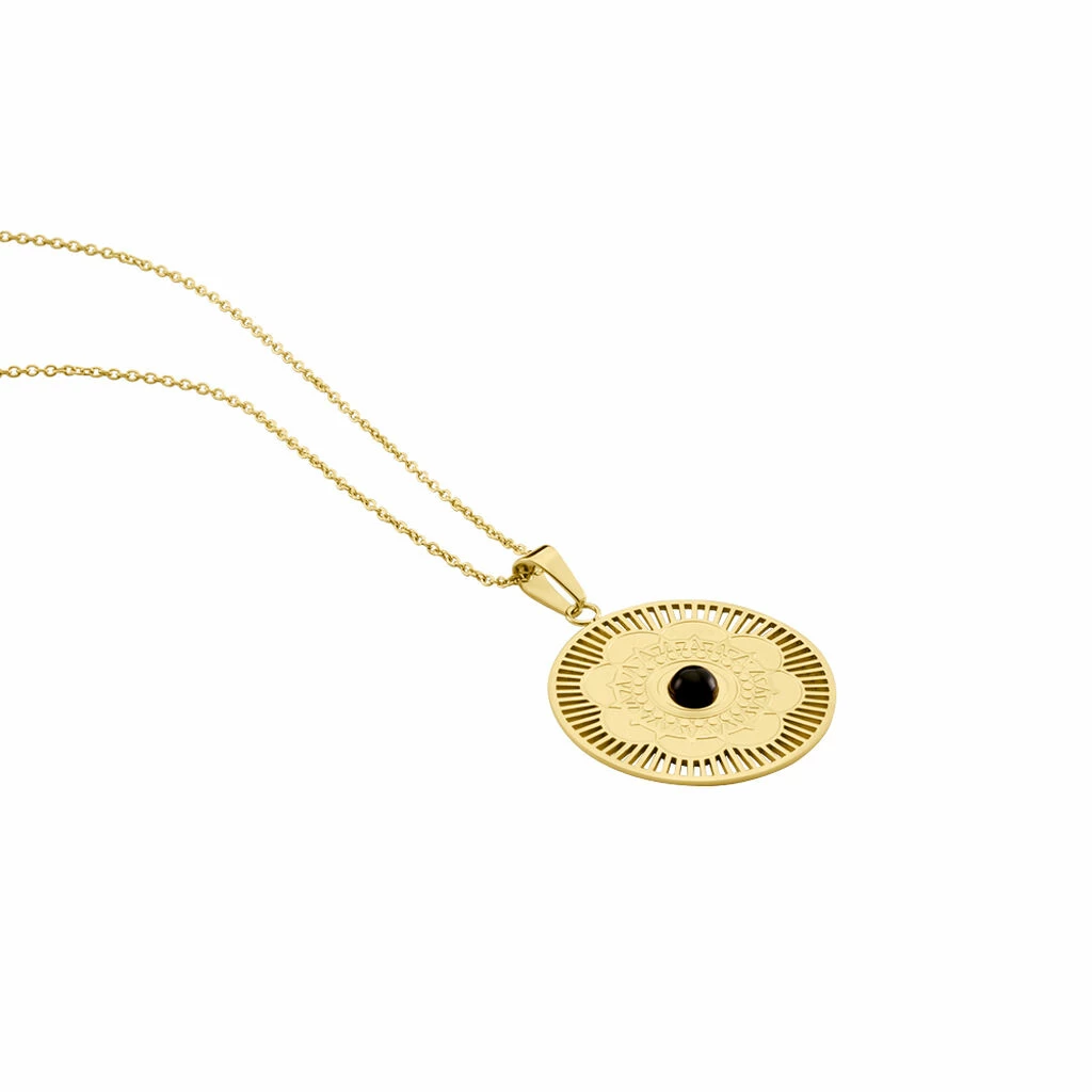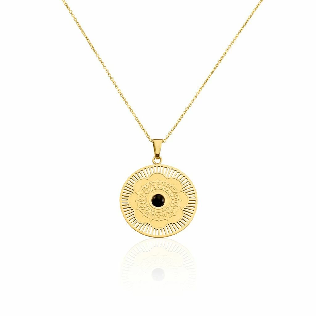 Collier Sautoir Acier Dore Rosace Agate Noire Maille Forcat 70cm