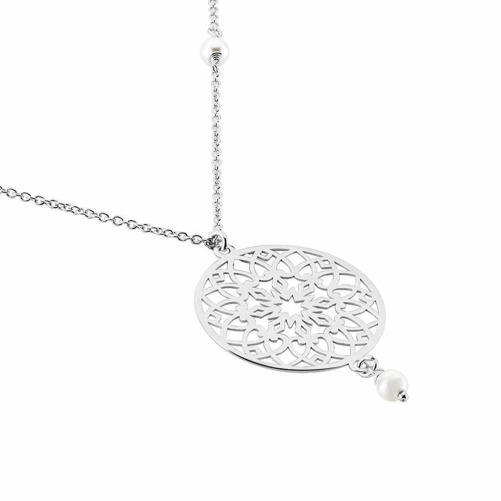 Collier Argent Blanc 925/1000 Rosace Et Perle De Culture Nacre 45cm