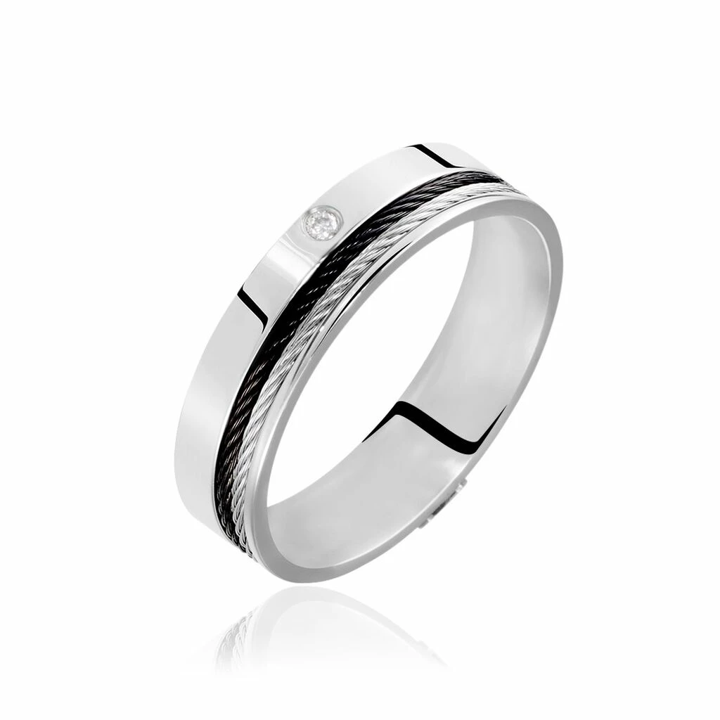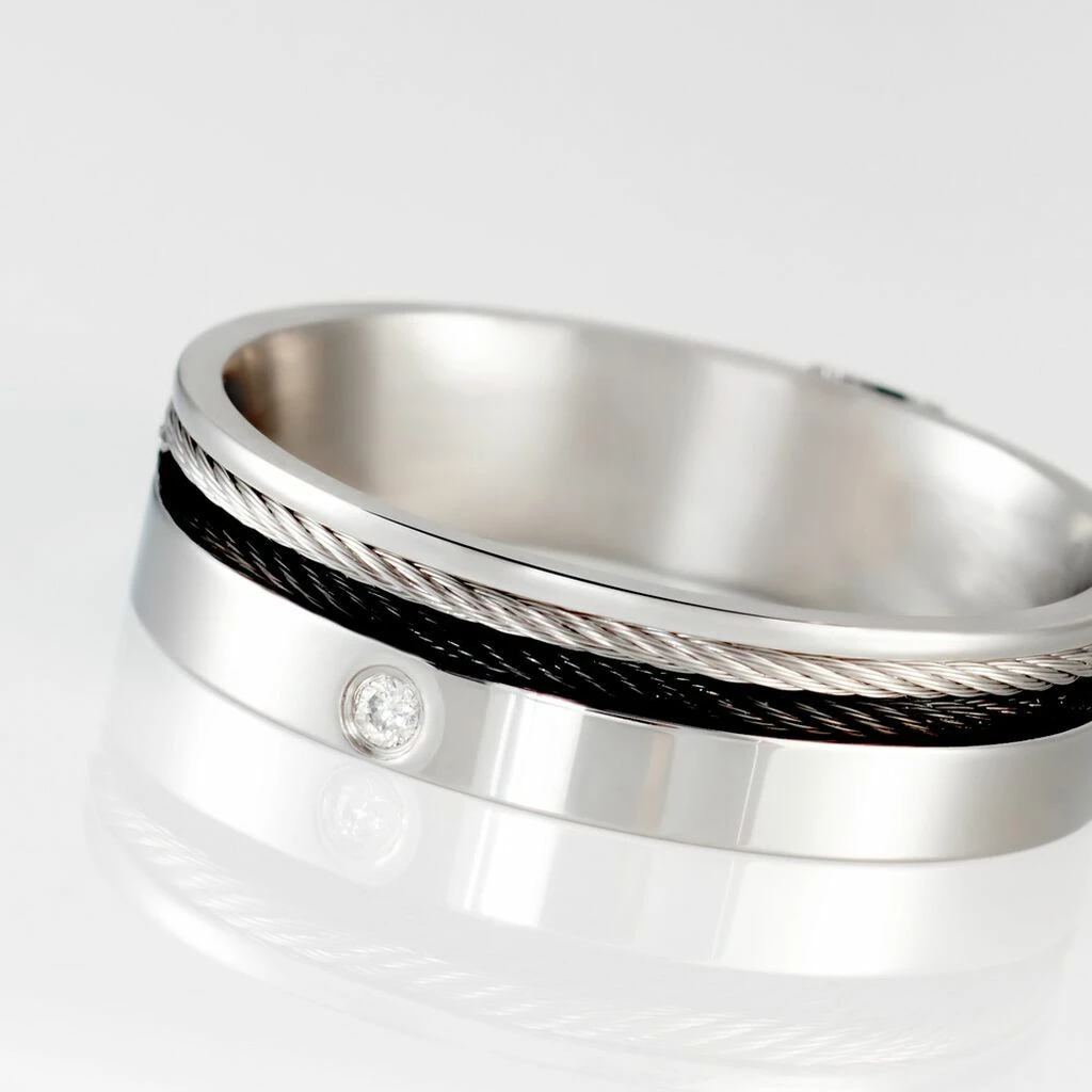Moderne et stylé en même temps, cette bague en acier est parfaite pour compléter vos looks branchés. Original, son anneau est caractérisé par des câbles noir et gris argenté. Un diamant blanc est disposé en serti clos pour donner davantage de caractère à cette bague.